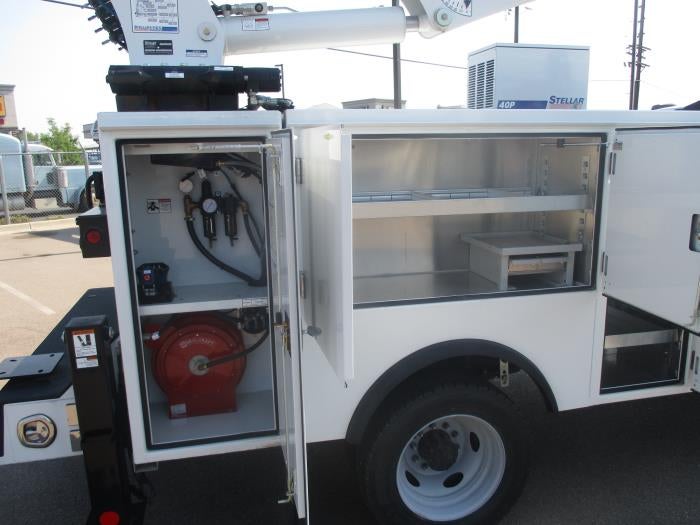 4.30 Limited slip axle, payload plus package, platform running boards, engine block heater, skid plates, interior work surface, high cap trailer tow package, rear view camera prep kit, Stellar crane body, TMAX 1-11 7630. TINIK compressor Price does not include state and local taxes; tags; registration or title fees; dealer-imposed fees, including document preparation, processing or servicing fees, or any optional equipment or upfitting work selected by buyer. Valid while supplies last. Images shown may not reflect actual vehicle.